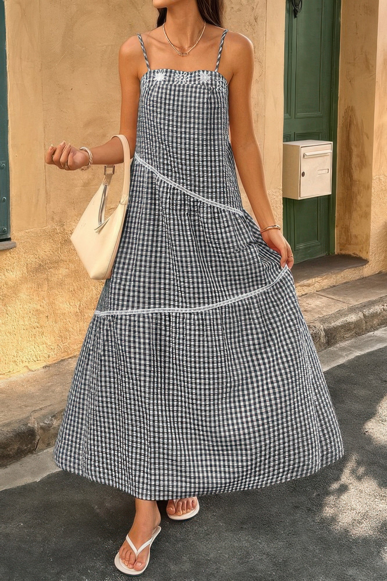 Features: Suspenders Plaid Color Block A Line Dress