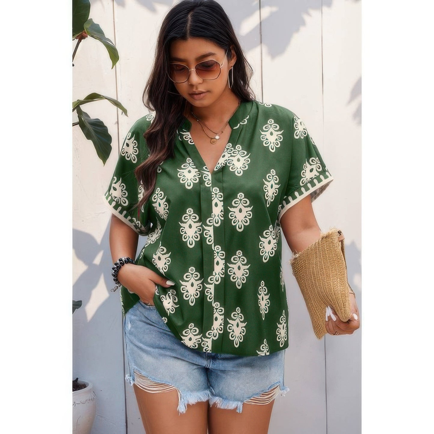 Easy, breathable, and full of charm, this Plus Size Short Sleeve V-Neck Printed Blouse is a wardrobe staple designed for comfort and effortless style. The V-neckline flatters the neckline, while the short sleeves offer relaxed coverage. Featuring an allover print, this blouse brings a vibrant touch to your everyday looks. Crafted from a soft polyester-elastane blend, it offers gentle stretch and a comfortable drape. Perfect for casual outings, workdays, or vacation wear, it's a versatile piece you'll reach for again and again.